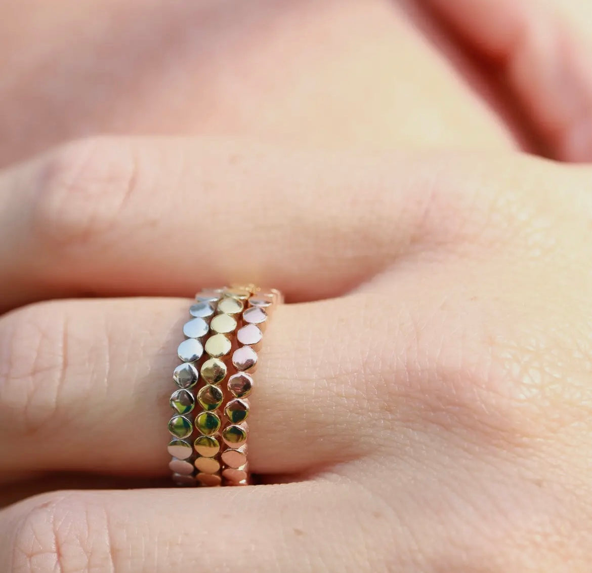 A band of flat circles gives this stacking ring it's modern look. The 2mm width makes it very easy to pair with other rings. The 14K Gold Flat Circle Stacking Ring is strong, durable, tarnish resistant, long lasting, and has a beautiful finish.