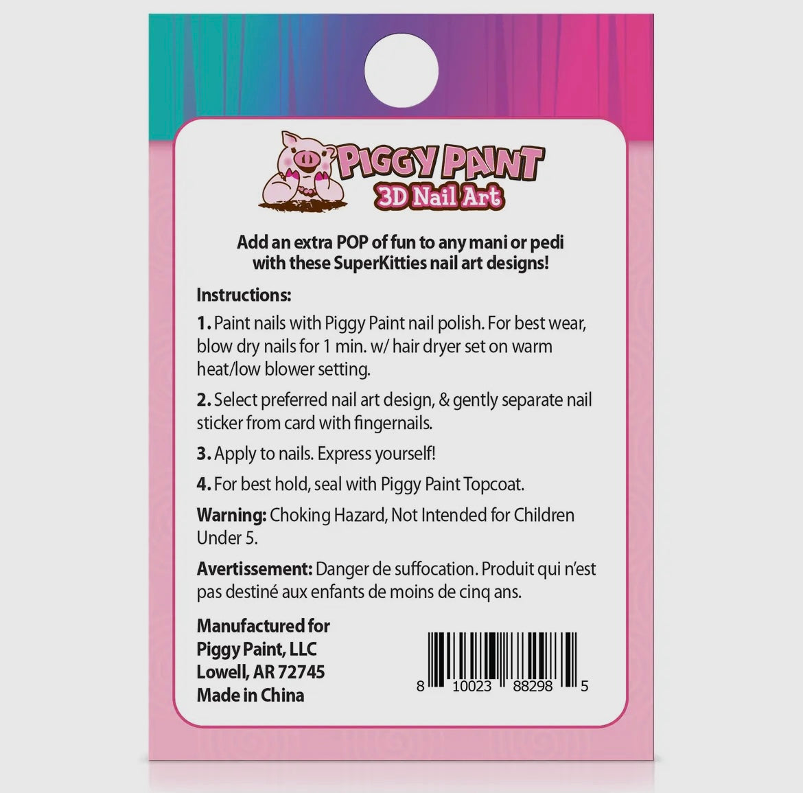 What's even better than a Piggy Paint manicure? A Piggy Paint manicure with fun 3-D Nail Art! First, paint your nails with your favorite Piggy Paint color. Next, top with Nail Art stickers for EXTRA fun and creativity! For long lasting wear, seal with Shine Topcoat & Blow Dryer.