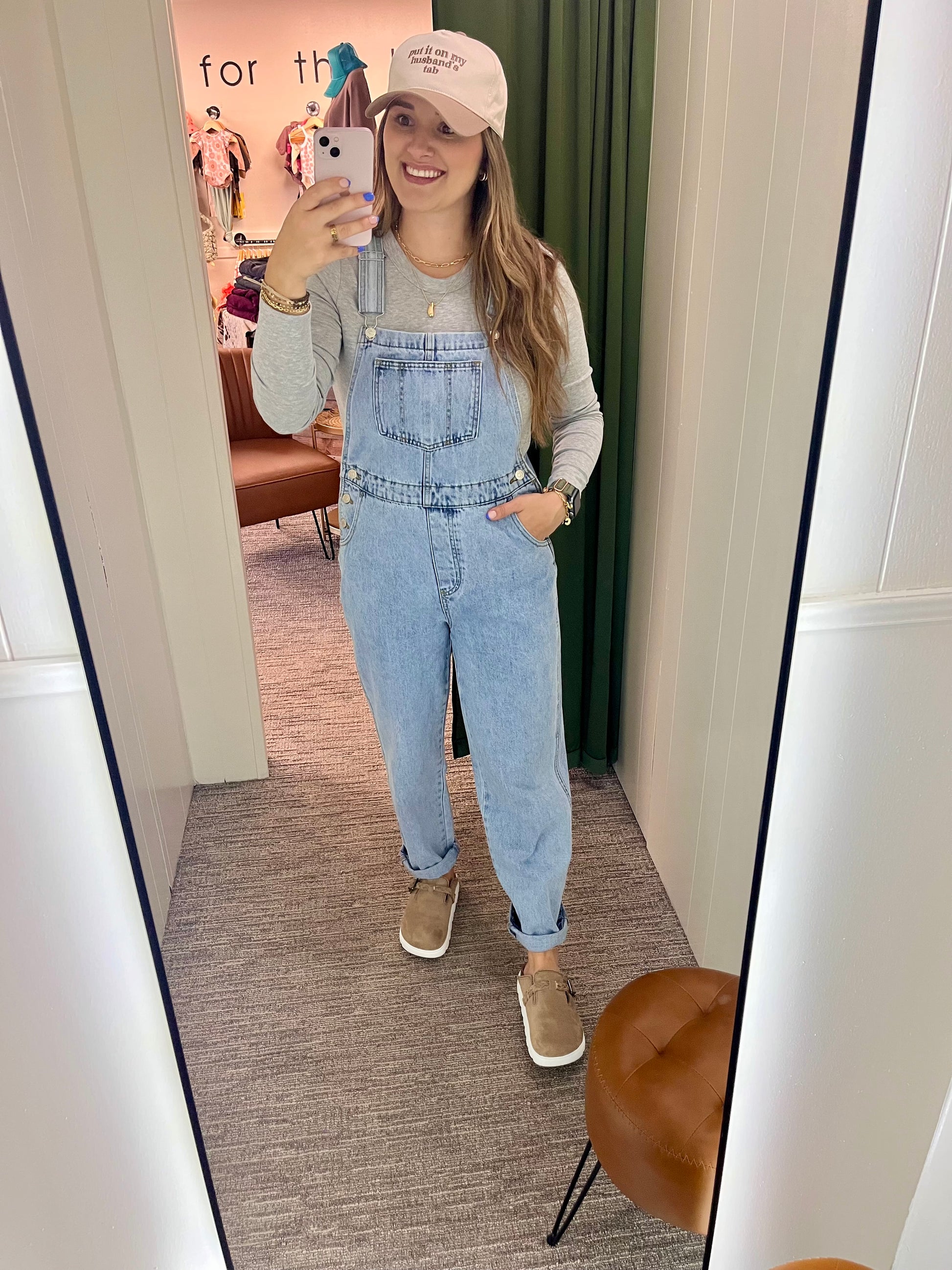 Our Alyssa Overalls are a non distressed, tighter fitting pair of overalls.