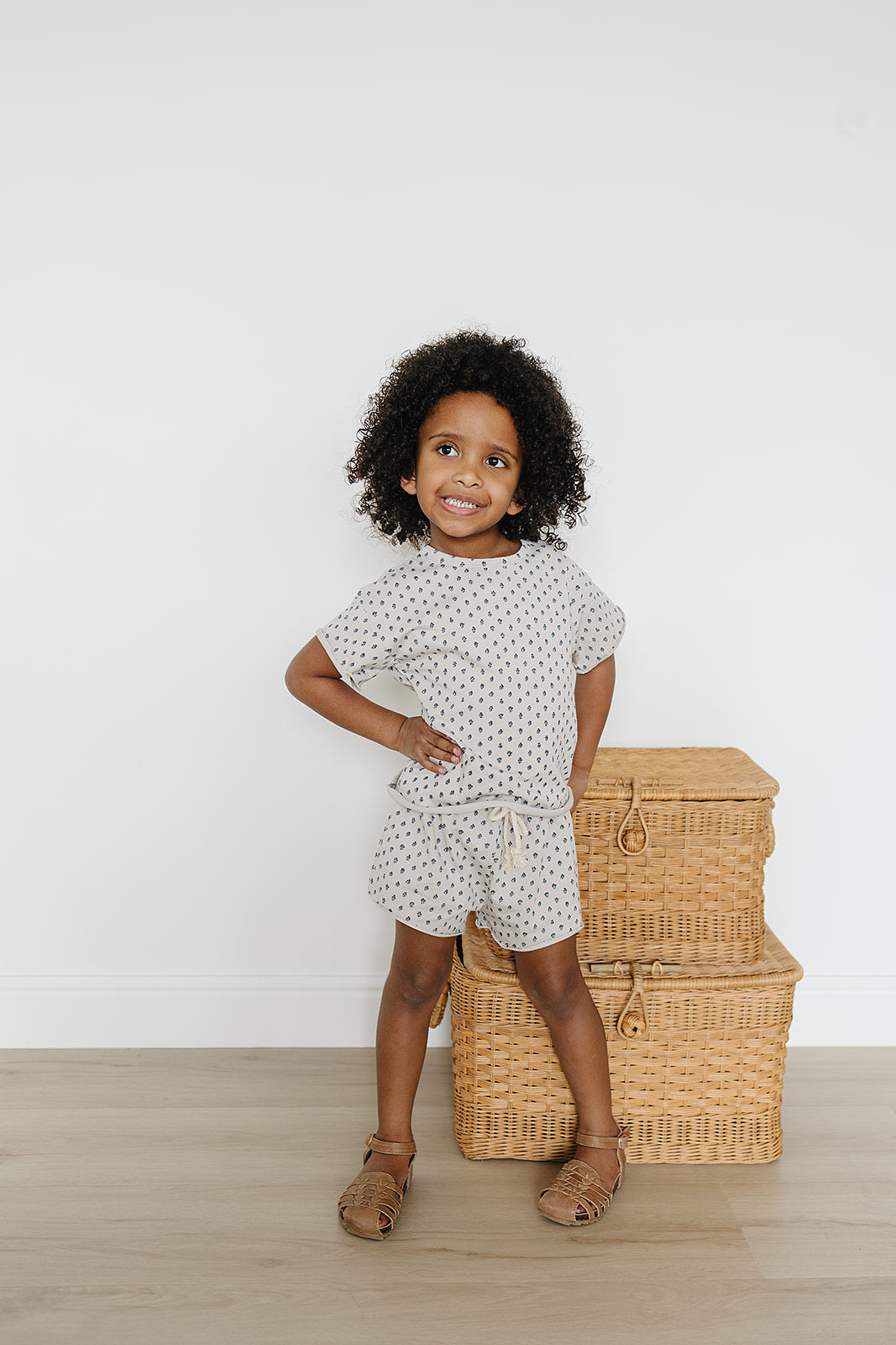 This Berry Floral Shorts Set is a sweet and stylish addition to your little one's spring and summer wardrobe! Featuring a neutral and timeless berry floral print and trendy raw hem detailing, this set offers both comfort and fashion. Made from soft, breathable cotton, it's perfect for warm days, whether they're playing in the park, attending a family picnic, or simply lounging at home. The raw hem gives this set a casual, cool vibe that’s sure to stand out!