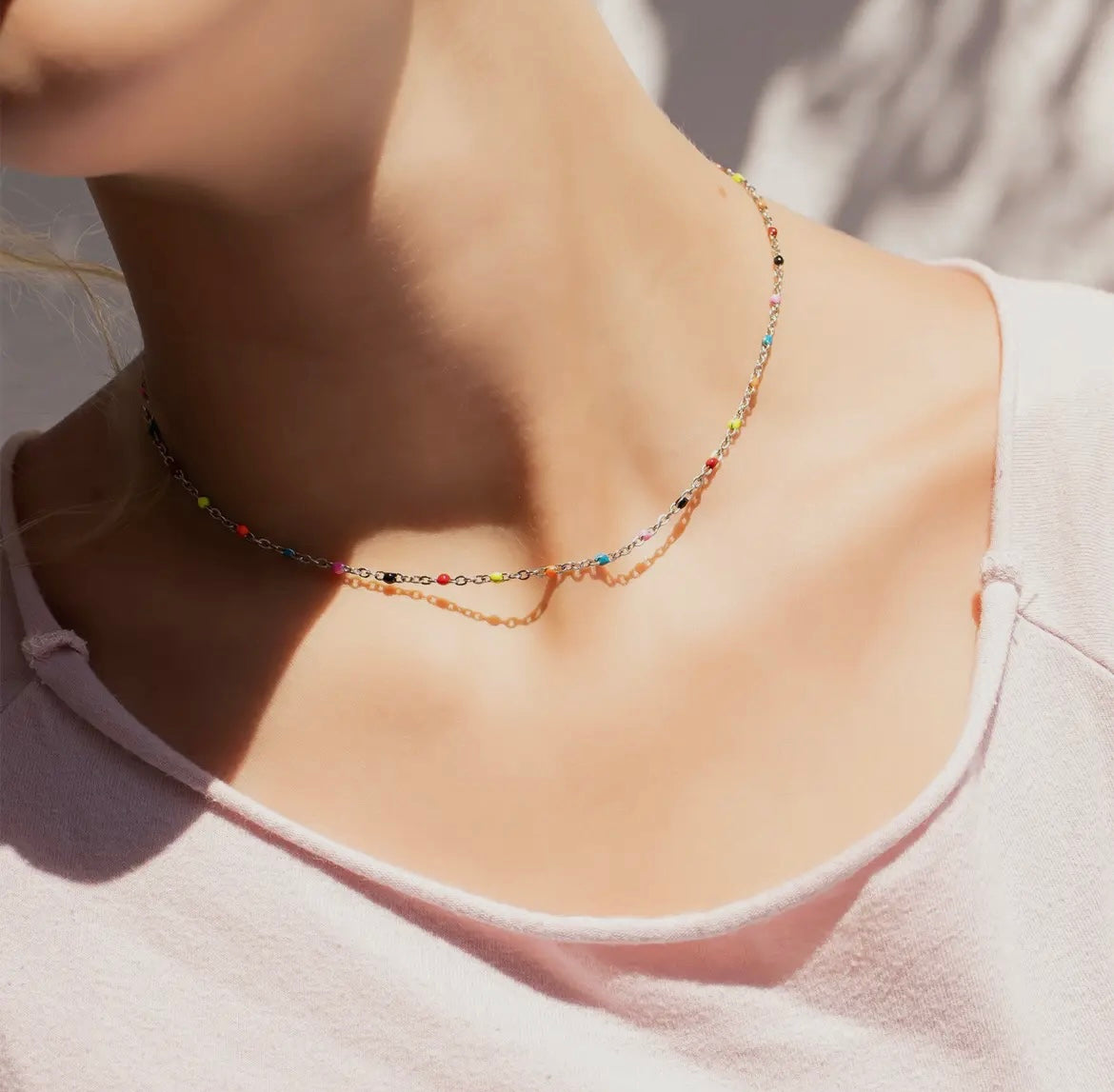 Playful yet polished, the multicolored confetti chain necklace brings a burst of color and shine to any look. Featuring vibrant enamel accents on a sleek 18K gold PVD stainless steel chain, it's lightweight, tarnish-resistant, and perfect for adding a fun twist to your everyday stack. Wear it solo or layered-either way, it's a party.