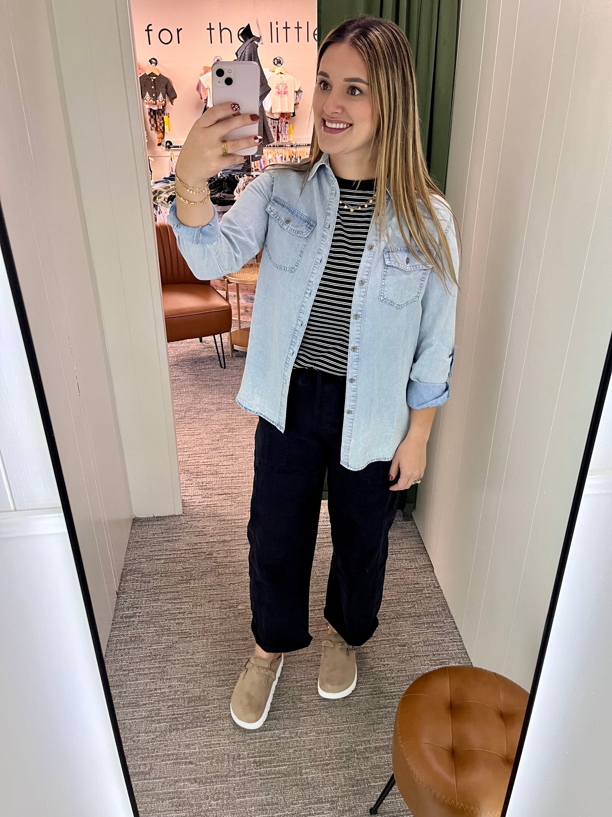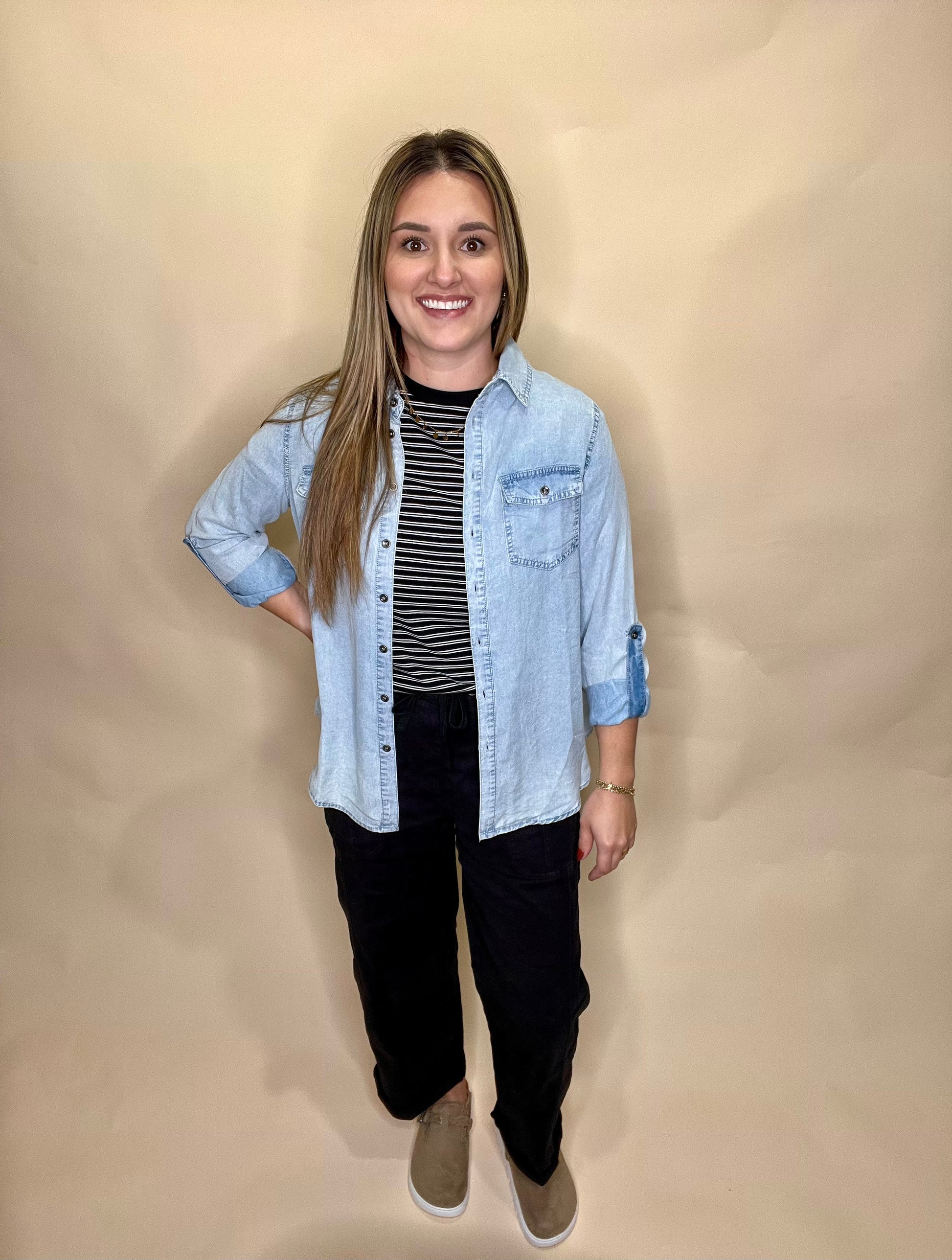 Our Jerrin Jean Button Down is a light weight jean button down, a great layering piece.