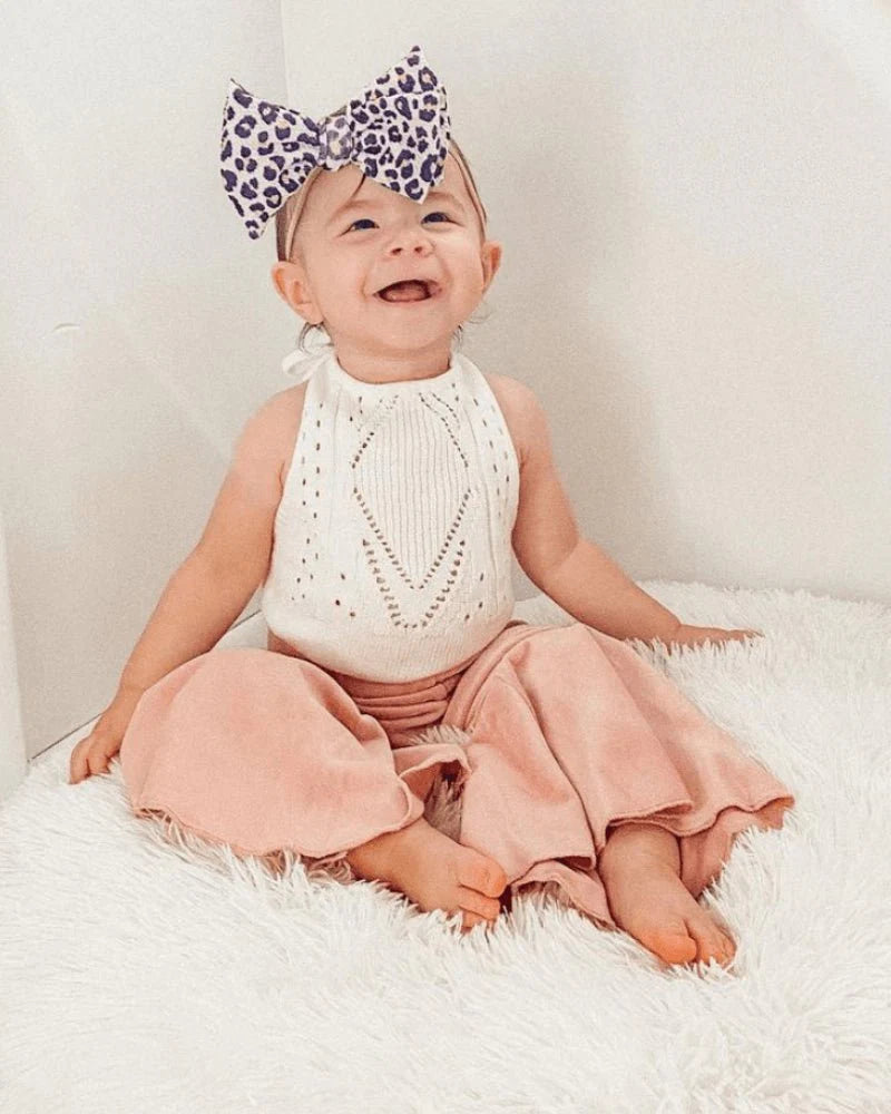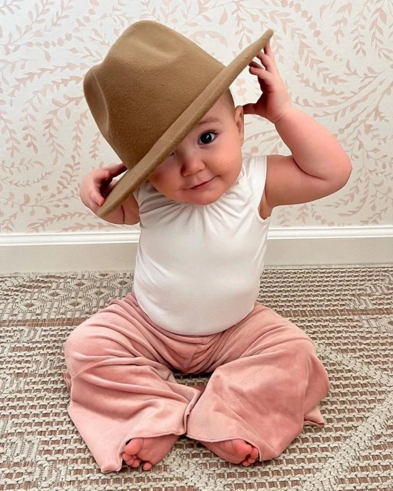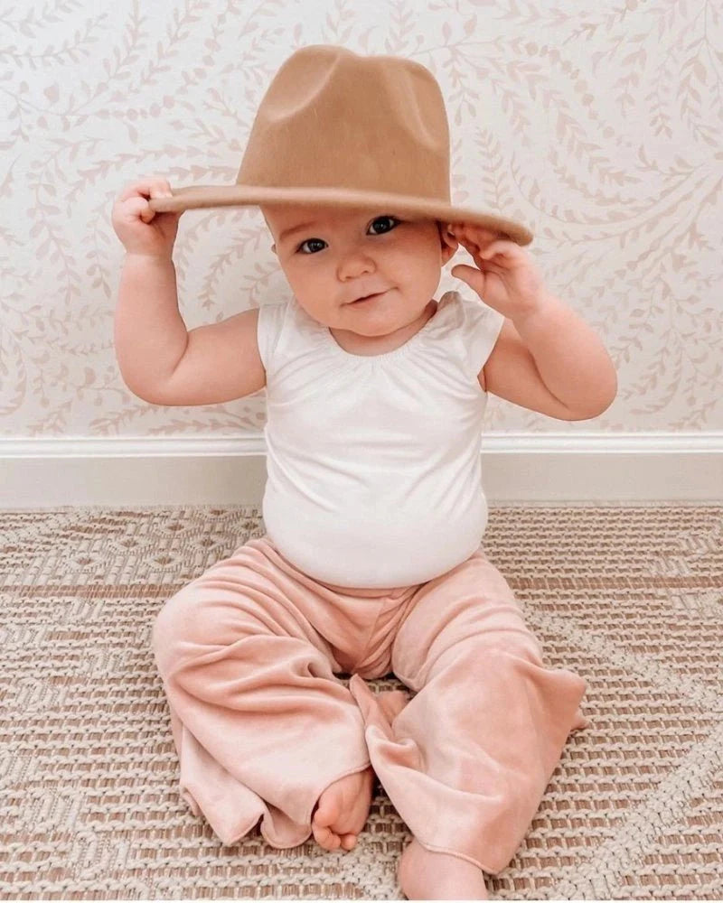 The Lina Pleated Velour Bell Bottoms just entered the scene and they are a stand-out feature. Soft and sweet as ever, the ultra soft fabric is perfect for your mini!