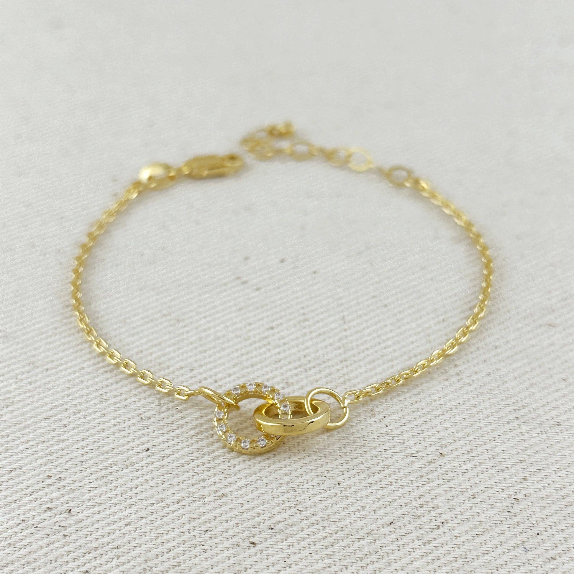 Elevate your style with the 18k Gold Filled Linked CZ Bracelet, featuring two elegantly connected circles—one shimmering with cubic zirconia stones, the other polished for a sleek contrast. This handcrafted, hypoallergenic piece offers water resistance and adjustable sizing for comfortable, everyday wear. Perfectly blending subtle luxury with versatility, it enhances both casual and formal looks with effortless glamour.