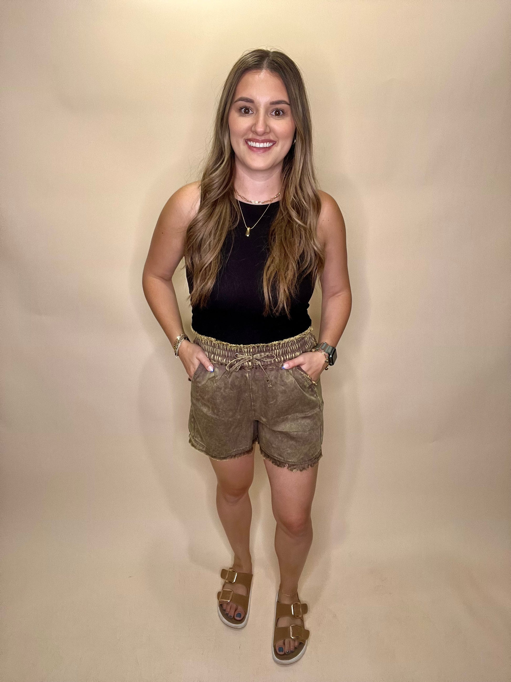 Our Rylan Shorts are have a draw string waist band, frayed details, and pockets. Great bottoms for hot weather!